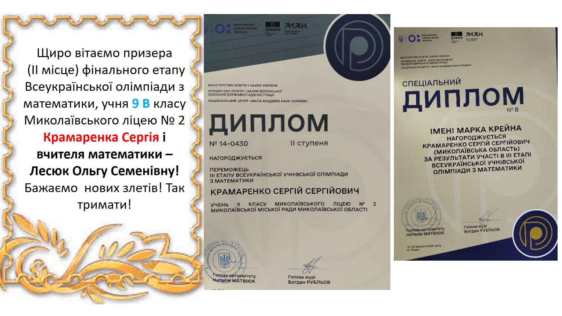 Миколаївський ліцей 2 щиро вітає Крамаренка Сергія, учня 9 В класу, як призера (ІІ місце) фінального етапу Всеукраїнської олімпіади з математики!