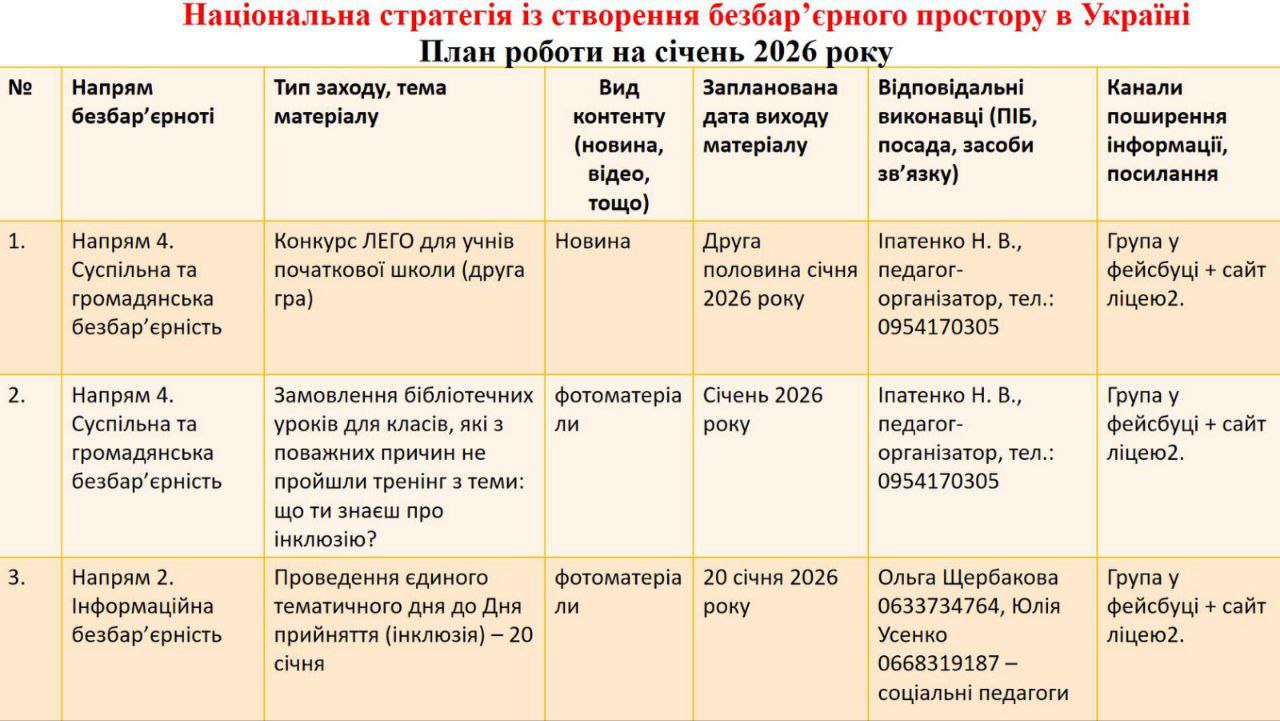 План заходів щодо створення безбар'єрного простору на січень 2026р.
