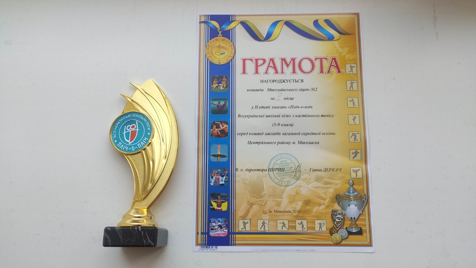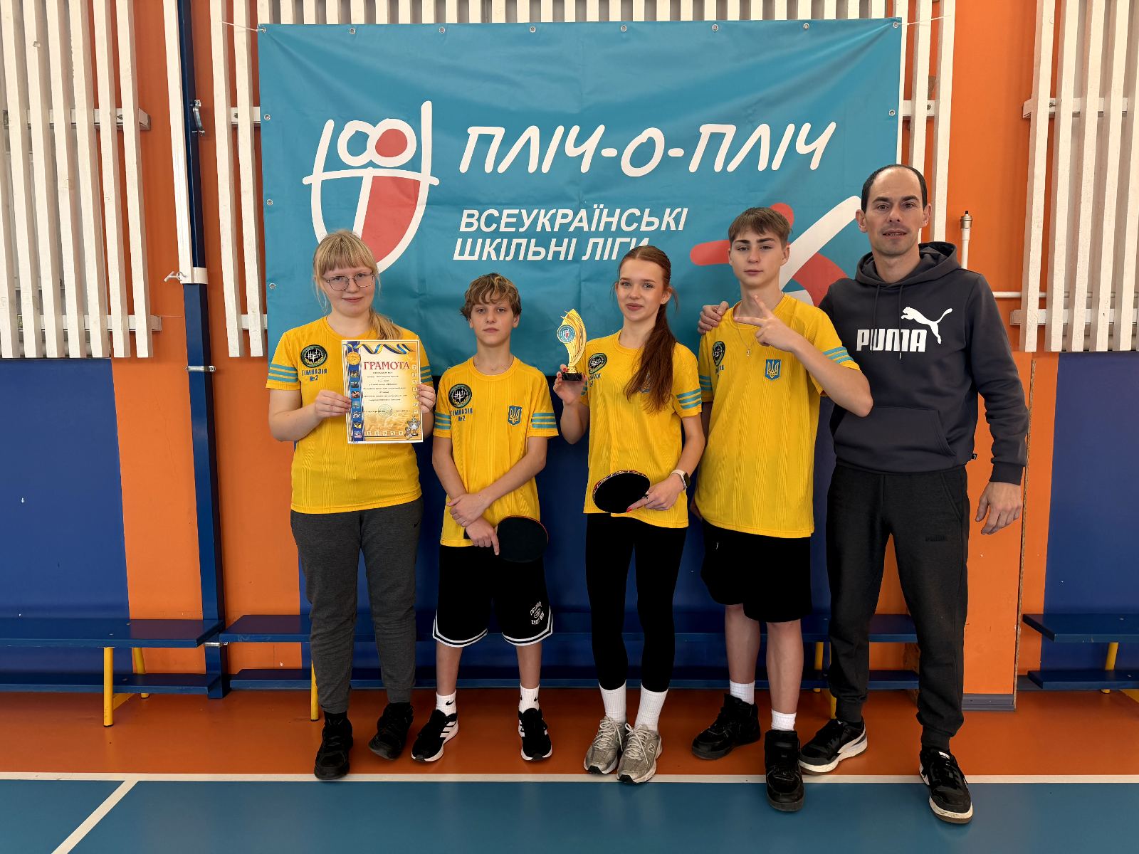 Вітаємо команду учнів 8-Б Романова, Усова, Лопатіну А., Слатвинську Т. Миколаївського ліцею з настільного тенісу за друге місце у змаганнях "Пліч -о-пліч"
