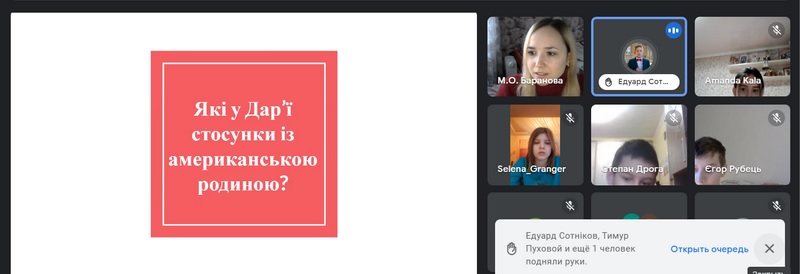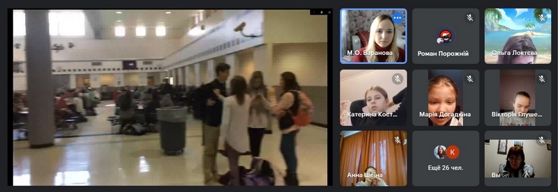 Другого лютого відбулася віртуальна зустріч учнів 5АБВГ класів з переможцем програми обміну майбутніх лідерів США – Дариною Казимир, яка протягом року навчалася в школі з посиленим вивченням предметів в штаті Джорджиа. Дар’я розповіла про свій досвід проживання в іншій родині, школу, спорт, свята, подорожі, показала фото та відео, інтерв’ю хост батьків і брата, вчителів, однокласників. Учні всіх класів були насамперед вражені стосунками між Дариною і родиною, яка прийняла чужу дівчинку як власну доньку і сестру, доброзичливістю вчителів,
